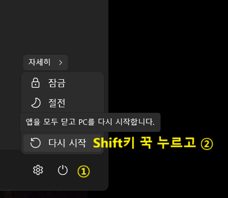 컴퓨터 끌 때 Shift를 꾹 누르면서 다시 시작 버튼을 눌러주면 된다